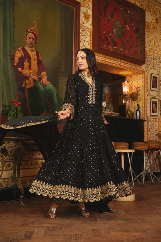 Black chicken georget anarkali with gold thread workRegular price $120.00 CADRegular priceUnit price / per-