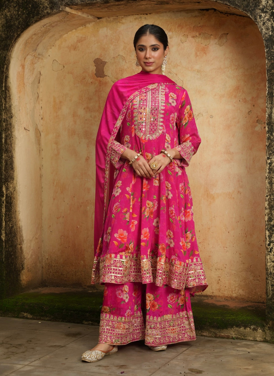 Chinon printed with gold embroidery sharara set